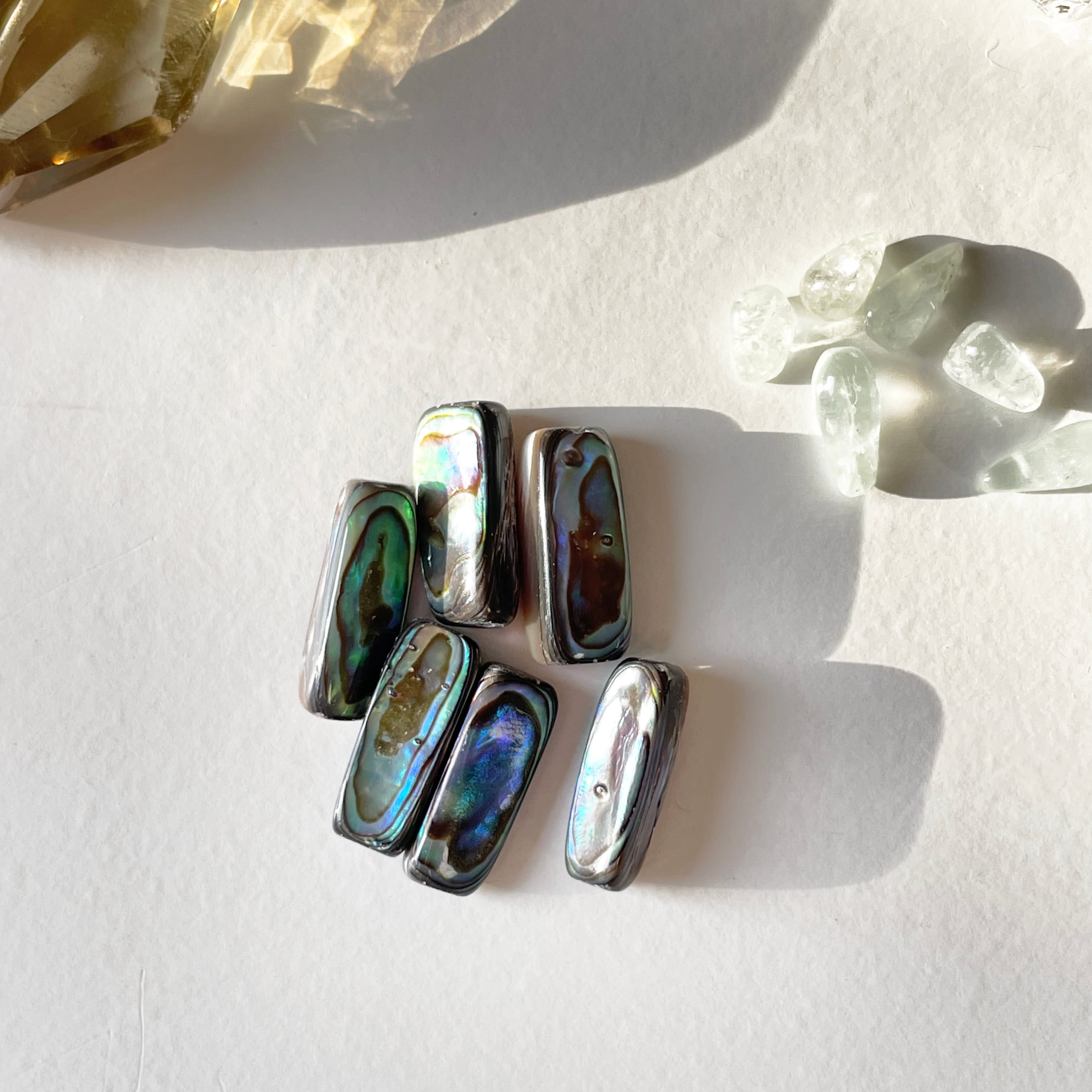 ガーデンクオーツ、ハーキマーダイヤモンドクオーツ、クリアクオーツ、カーキレモンクオーツ、アマゾナイト、シトリン、スモーキークオーツ、アバロンシェル、サンストーン、ピンクエピドート、ロードナイトインクオーツ、アメジスト、グリーンアメジスト、エンジェライト、グリーンフェルスパー、イエローフローライト、ブラックラブラドライト、クリソコラ、クリソプレーズ、ラピスラズリ、フォスフォシデライト、シュンガイト
